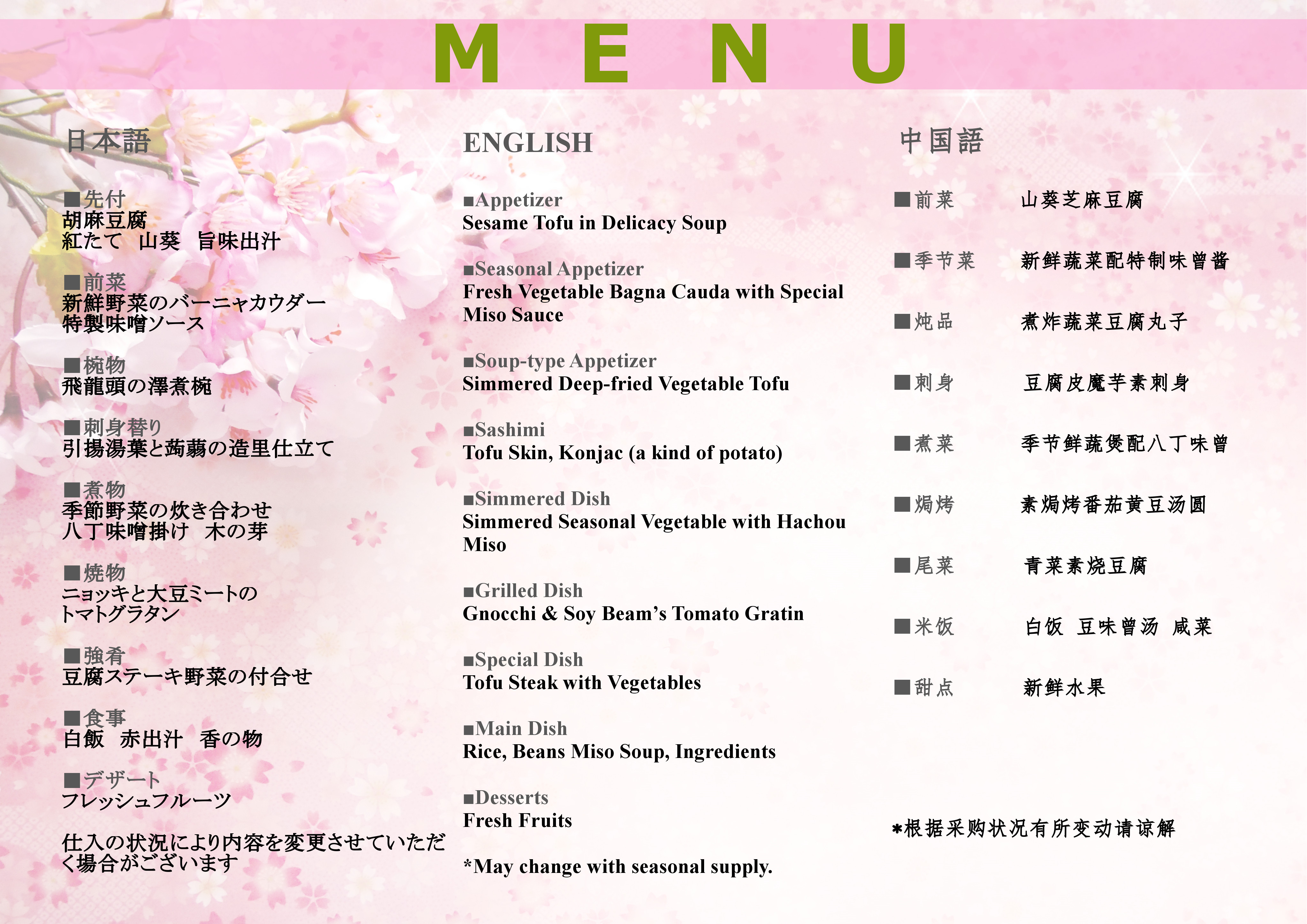当館では多様に対応すべく、お客様の様々なご要望・ご希望に真摯に取り組んでおります。そんな中、今回はご意見を多くいただきましたお食事メニューに≪菜食メニュー≫(ベジタリアンメニュー)を追加いたしました。