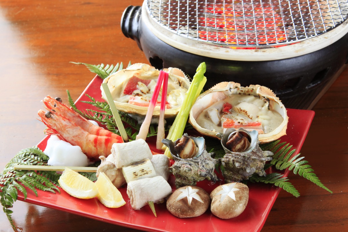 炉皿:さざえ磯焼、車エビ塩焼、もち豚麹焼